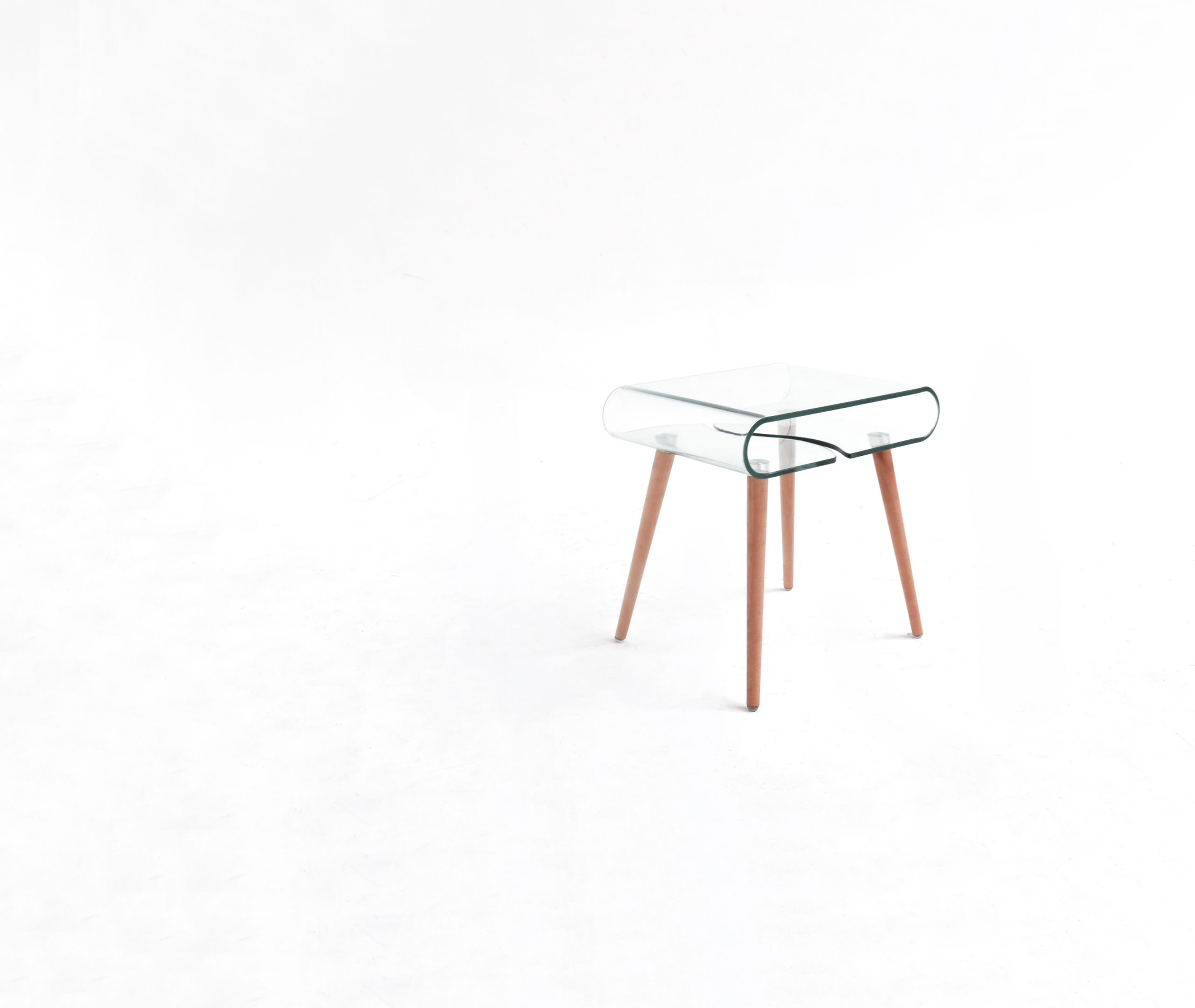 Mesa lateral con patas de madera y tope de vidrio grueso.